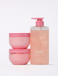Indulge in the full romance routine with the Berry Much Love You Bundle. Includes Shimmer Shower Gel, Body Scrub and Body Butter for soft, hydrated skin scented with strawberries & cream, and rose.